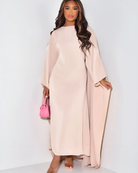 Denne lange kjole indkapsler nåde og femininitet med en flydende silhuet og omhyggelige detaljer. Den klassiske runde halsudskæring og de draperede ærmer tilføjer et strejf af raffinement med blødhed. Perfekt til ceremonier, formelle middage eller elegante aftener.