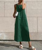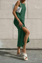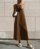 Dieses lange Kleid besticht durch seinen minimalistischen Stil und den fließenden Fall, der die Silhouette auf natürliche Weise unterstreicht. Der schlichte Schnitt und die diskreten seitlichen Schlitze machen es zu einem perfekten Teil, um Komfort und Raffinesse zu kombinieren. Leicht und angenehm zu tragen, passt es sowohl zu sonnigen Tagen als auch zu entspannten Momenten im Urlaub.