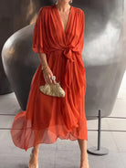 Αυτή η ρέουσα midi φόρεμα αναδεικνύει τη σιλουέτα με ελαφρότητα. Η φυσική του πτώση εξασφαλίζει απόλυτη άνεση ενώ προσθέτει μια κομψή και χαλαρή αίσθηση. Ιδανικό για ηλιόλουστες ημέρες ή επίσημες βραδιές.