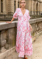 Αυτό το μακρύ λουλουδένιο φόρεμα ενσωματώνει τέλεια το πνεύμα της boheme chic. Το λεπτό floral σχέδιο και η ρευστή του γραμμή προσφέρουν μια κομψή και φυσική σιλουέτα. Ελαφρύ και άνετο, είναι ιδανικό για ηλιόλουστες μέρες, καλοκαιρινές αποδράσεις ή χαλαρές βραδιές.