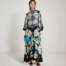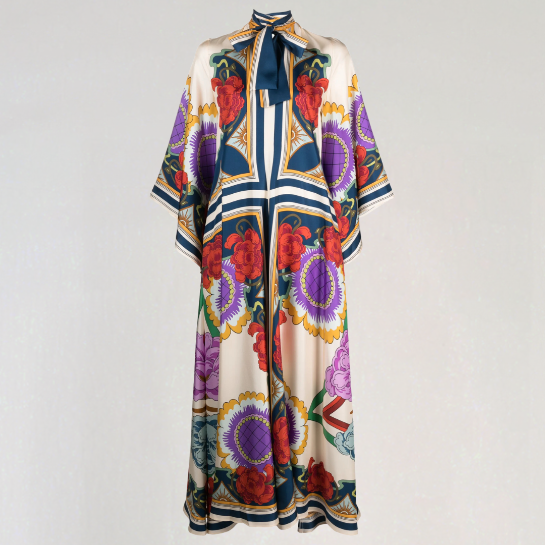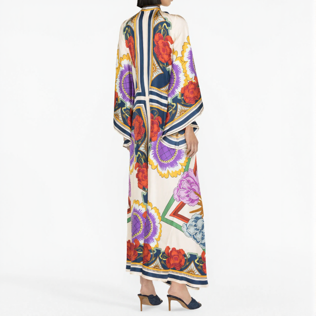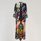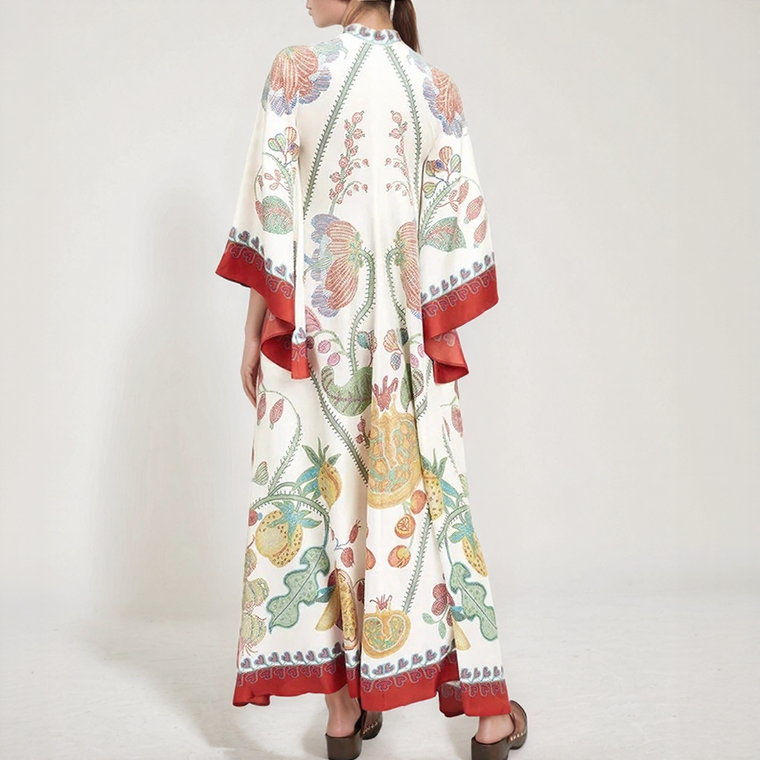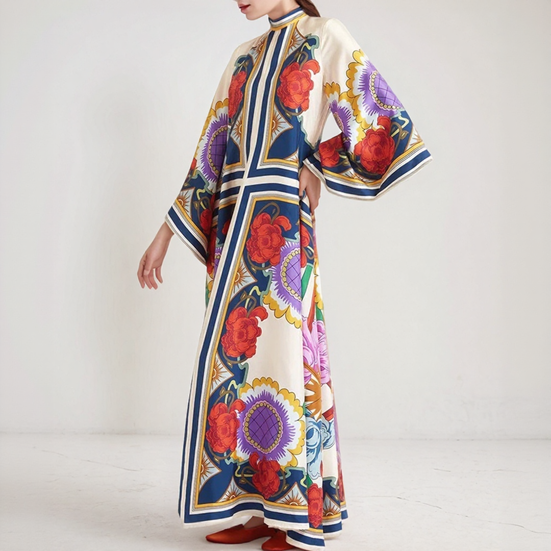 Αυτή η μακριά φόρεμα διαθέτει τολμηρά λουλουδάτα σχέδια και ρέουσα γραμμή. Ο ψηλός γιακάς της με λεπτομέρεια κόμπου στο πίσω μέρος προσθέτει μια κομψή πινελιά. Ιδανική για όλες τις εποχές, προσφέρει μια διαχρονική μποέμικη κομψότητα.