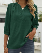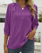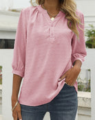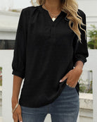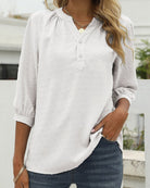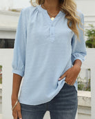 Αυτή η κλασική μπλούζα συνδυάζει μια διαχρονική γραμμή με μια μοντέρνα πινελιά. Ο ανοιχτός γιακάς με κουμπιά προσθέτει στυλ, ενώ τα ελαφρώς φουσκωτά μανίκια προσφέρουν μια θηλυκή νότα. Ιδανική για μια περιποιημένη και άνετη εμφάνιση κάθε μέρα.