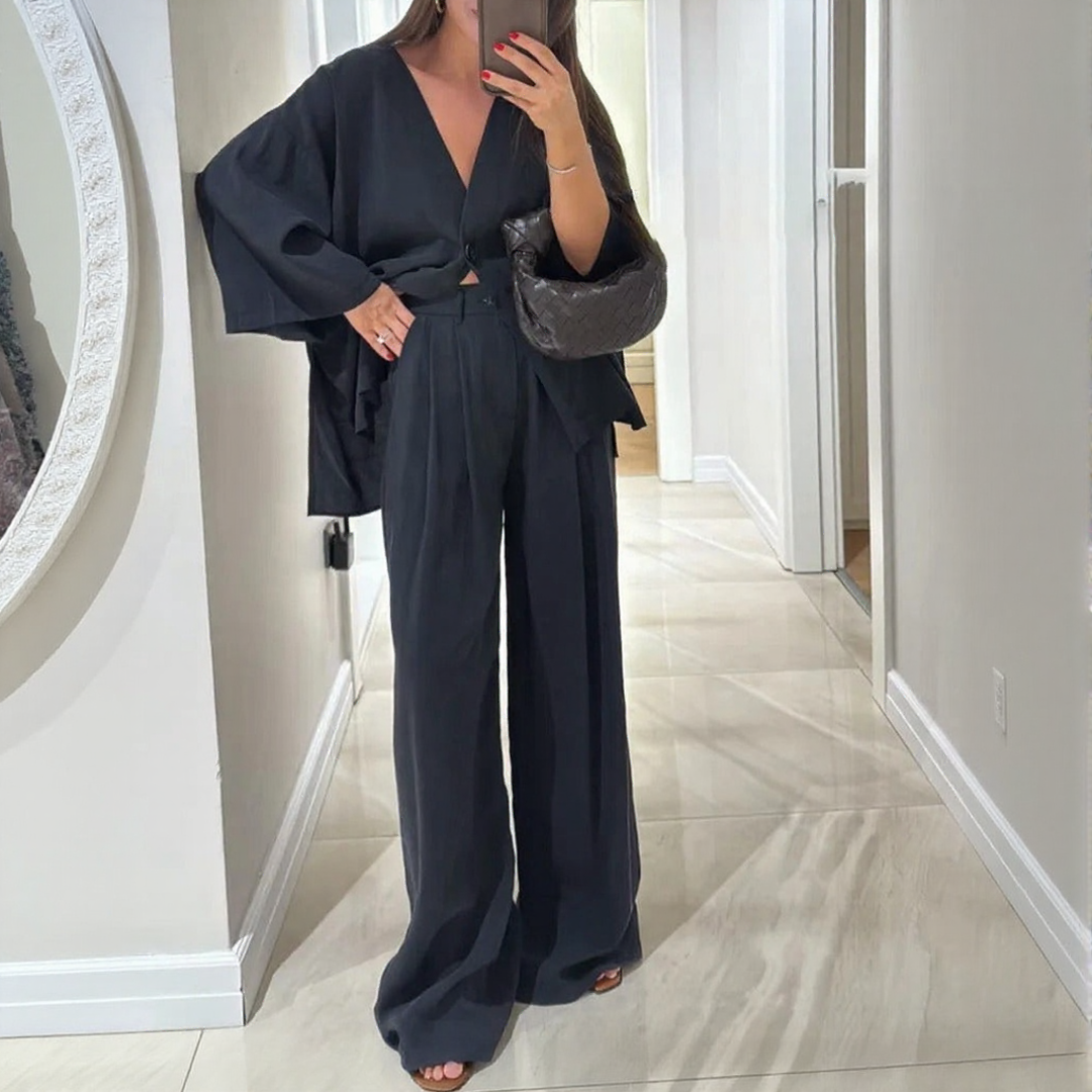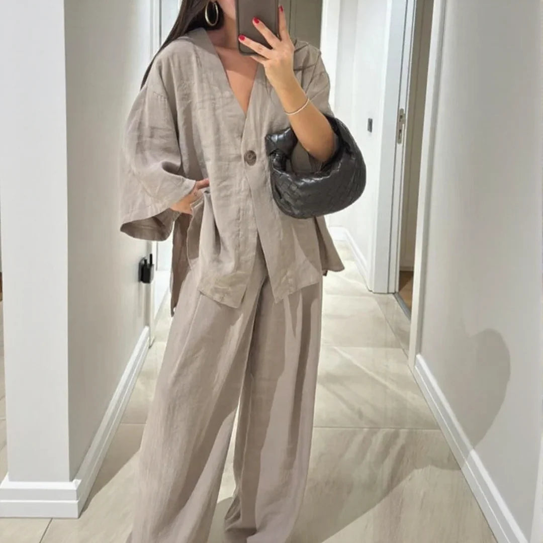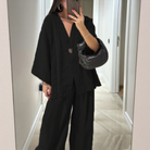 This set combines a flowing tunic with wide pants for an elegant silhouette. Designed to provide optimal freedom of movement, it is ideal for warm days. Perfect for casual outings or relaxing moments at home.