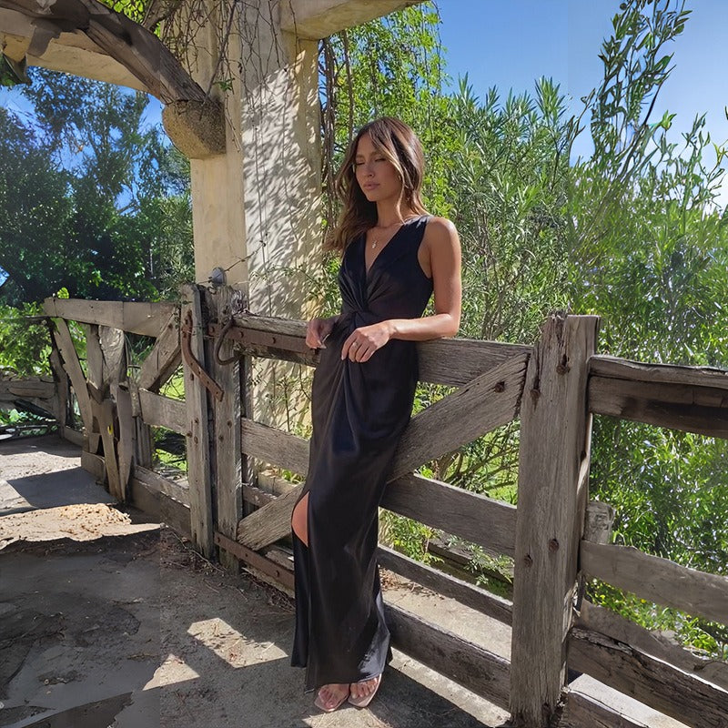 Tämä halkioilta-asu korostaa siluettia elegantin halkionsa ja kevyen leikkauksensa ansiosta. Suunniteltu suuria tilaisuuksia varten, se yhdistää hienostuneen tyylin ja liikkumisen vapauden. Sen ajaton muotoilu takaa tyylikkään ilmeen kaikissa tilanteissa.