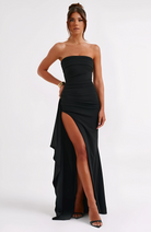 Tämä pitkä olkaimeton mekko myötäilee vartaloa elegantisti sen kapean leikkauksen ansiosta. Sen hienostunut avonainen selkä ja korkea halkio korostavat kävelyä samalla kun ne lisäävät hallittua seksikkyyttä. Täydellinen tyylikkäisiin iltoihin ja erityisiin tilaisuuksiin, joissa ulkonäöllä on merkitystä.