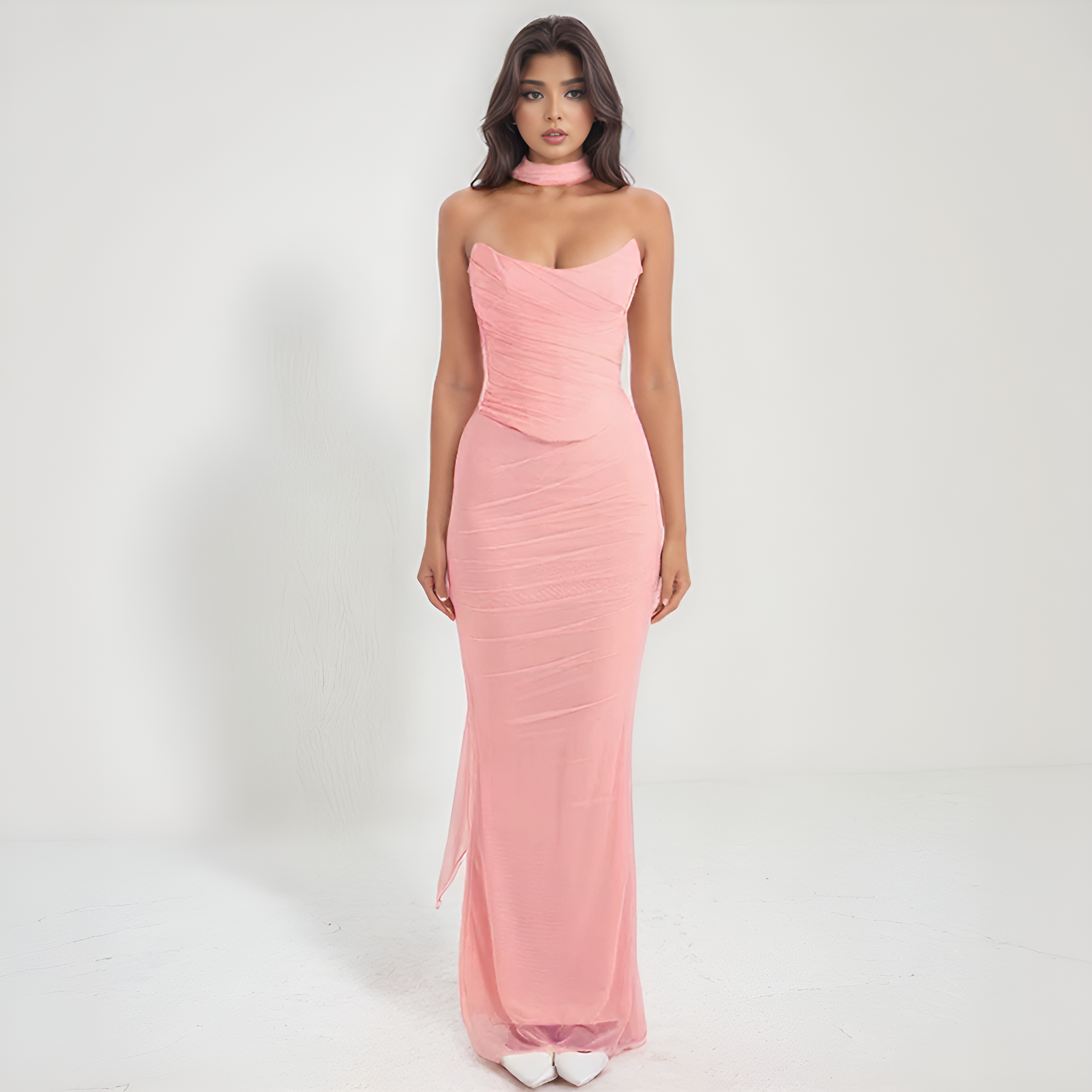 פרי | שמלה ארוכה שתי חלקים – אלגנטיות ללא רצועות וצעיף תואם