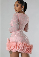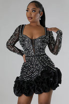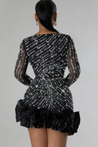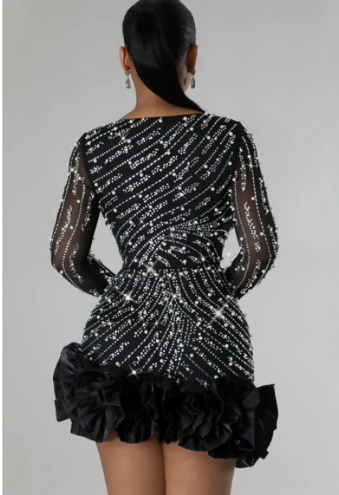 שמלות מיני צמודה זו מעוטרת באבני קריסטל זוהרות. הצווארון בצורת V העמוק ושרווליה הארוכים והצמודים מציעים דמות מתוחכמת. מושלמת לערבים ואירועים מיוחדים.