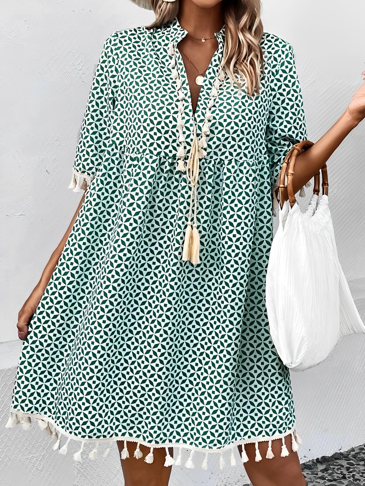 השׂמלה הזו לקיץ מציגה דפוס מודרני וגזרה נוחה. הזרועות הקצרות והקלילות שלה הופכות אותה לבחירה אידיאלית לימי שמש. מושלמת לעיר, לחופשה או ליציאה עם חברים.