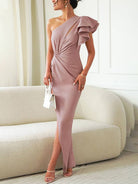 השמלה הארוכה הזו מציגה גזרה זורמת עם כתף חשופה. השכבות והחריצים הצדדיים מוסיפים נופך של sophistication. מושלם לחתונות, ערבים ואירועים רשמיים אחרים.