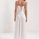 Questo abito lungo valorizza la silhouette grazie al suo corpetto stile corsetto che sottolinea delicatamente la vita. La sua linea fluida conferisce movimento e grazia, mentre la schiena corsettata aggiunge un tocco romantico e strutturato. Ideale per serate, galà o cerimonie.