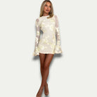 Questo abito midi affascina per il suo delicato ricamo floreale e le sue maniche lunghe leggermente trasparenti. La schiena nuda aggiunge un tocco di sensualità discreta, perfetta per occasioni speciali. Disponibile in diverse colorazioni, si adatta a tutte le vostre voglie con eleganza.