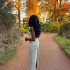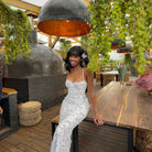 Questo vestito bianco ricamato incarna la grazia con il suo scollo a cuore e la sua vestibilità aderente. Il corpetto abbraccia elegantemente la silhouette, mentre le sottili spalline aggiungono un tocco di delicatezza. Perfetto per le grandi occasioni, riflette un'eleganza senza tempo e raffinata.