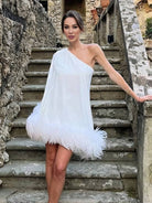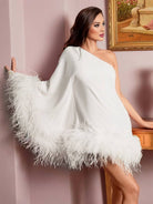 このワンショルダーのミニドレスは特別な場面に最適です。ケープスリーブのユニークなデザインが洗練された雰囲気を加えます。カクテル、舞踏会、パーティーにぴったりです。