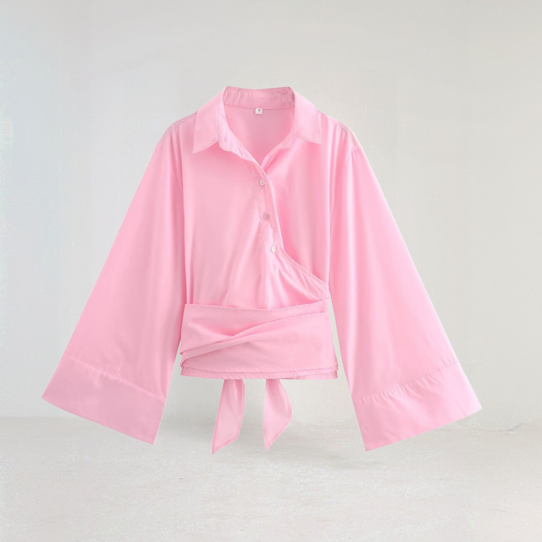この夏の女性用ポートフォリオシャツは、Vネックとフレアスリーブで魅力的なシルエットを提供します。ダブルボタンのクロス閉じが洗練さを加えています。暑い日にはぴったりで、快適さとスタイルを兼ね備えています。