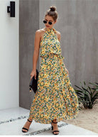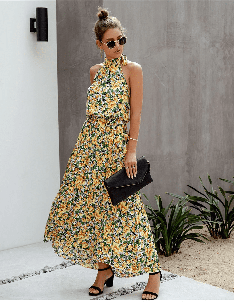 このロングボヘミアンドレスは、鮮やかな花柄プリントと首に結ぶための洗練されたストラップで魅了します。流れるようなシルエットが微妙に体型を引き立て、暑い日々に理想的な快適さを提供します。夏のエスケープや街の散策にぴったりです。