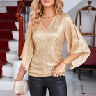 このブラウスは、洗練されたVネックと優雅に落ちるフレアスリーブでシルエットを引き立てます。きらめくスパンコールがあなたのルックにさりげないグラマラスなタッチを加えます。夜の外出や特別な occasion に最適で、洗練されたスタイルと絶対的な快適さを兼ね備えています。