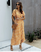 このエレガントなロングドレスは、田舎の結婚式や屋外のパーティーに最適です。フレアシルエット、Vネック、細いベルトが優雅にシルエットを引き立てます。花柄と黄色の色合いが春らしく明るい印象を与えます。