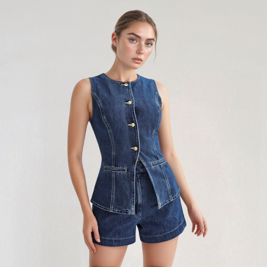 Cet ensemble comprend un gilet sans manches structuré avec des boutons dorés et des poches avant. Le short taille haute offre une coupe flatteuse et un confort optimal.